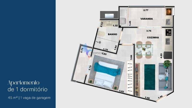 Os apartamentos de um dormitório têm 45 m² e também incluem uma vaga de garagem.