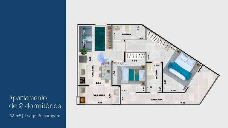Os apartamentos de dois dormitórios são um pouco maiores, com 63 m², e também têm uma vaga de garagem.