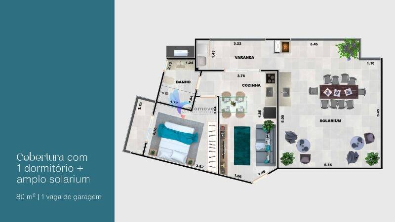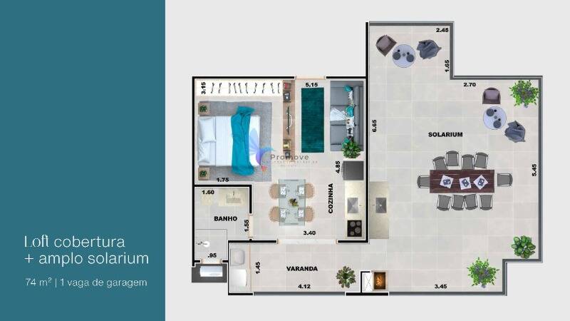 As coberturas com um dormitório e um amplo solarium têm 80 m² e uma vaga de garagem.