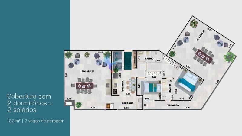 As coberturas com dois dormitórios e dois solários têm 132 m² e duas vagas de garagem.